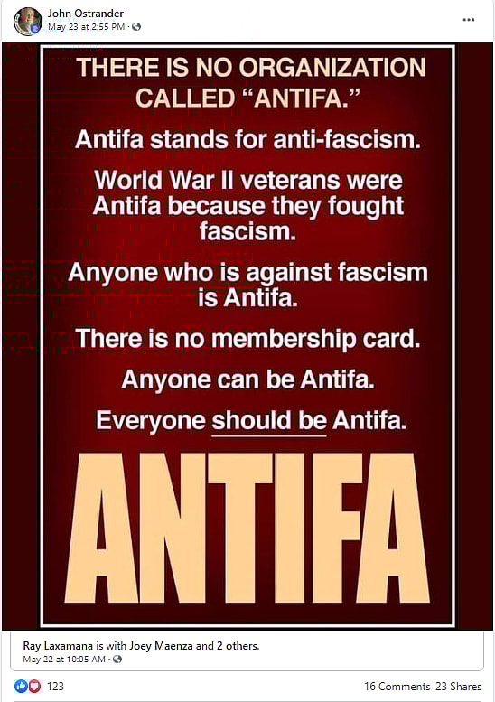 The meme reads, “There is no organization called ‘Antifa.’ Antifa stands for anti-fascism. World War II veterans were Antifa because they fought fascism. Anyone who is against fascism is Antifa. There is no membership card. Anyone can be Antifa. Everyone should be Antifa. Antifa.”