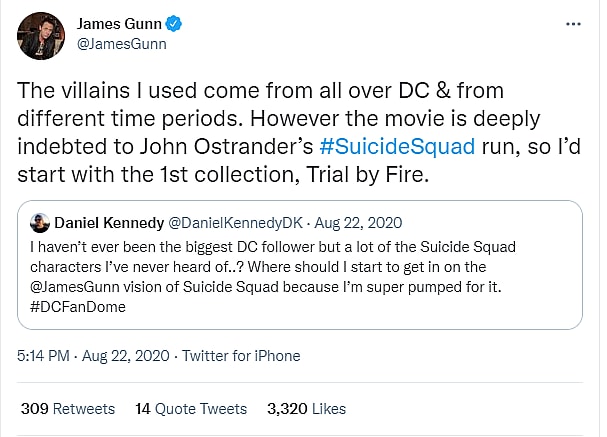 And back in August 2020 he wrote, “The villains I used come from all over DC & from different time periods. However the movie is deeply indebted to John Ostrander’s Suicide Squad run, so I’d start with the 1st collection, Trial by Fire.”