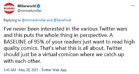 In a subsequent tweet Millar said, “I’ve never been interested in the various Twitter wars and this puts the whole thing in perspective. A BASELINE of 95% of your readers just want to read high quality comics. That is what this is all about.”