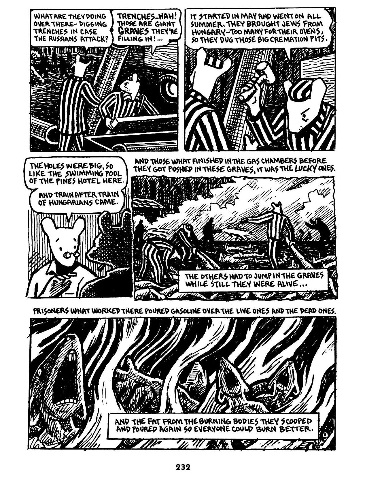 Despite the depiction of its subject matter as anthropomorphized animals, with, for example, cats and mice serving as stand ins for Nazis and Jews respectively, Maus does not shy away from visually recounting the horrors and brutality of the Holocaust.