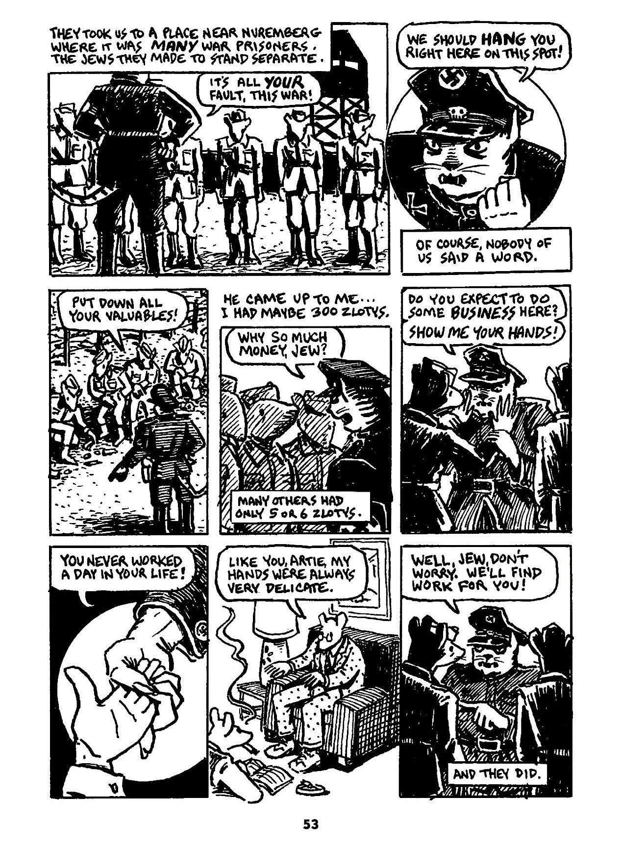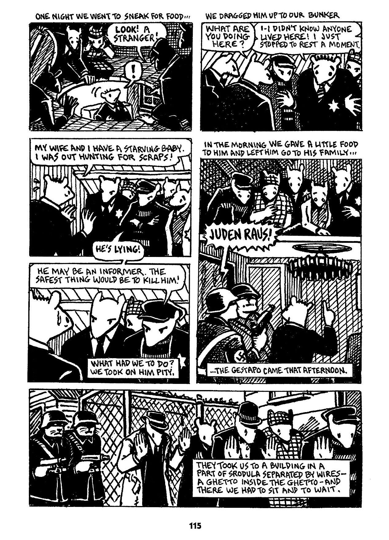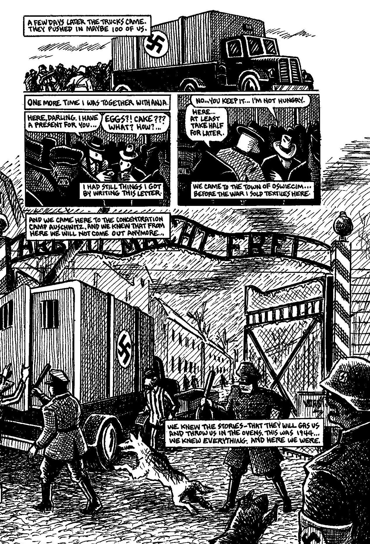 Rather, Spiegelman spends the entirety of the graphic novel illustrating the Nazi concentration camp horrors relayed to him by his father, such as a Nazi killing a child by slamming him against a wall by his legs or prisoners’ deaths by gassing the very chambers they were ordered to construct, as accurately as possible.