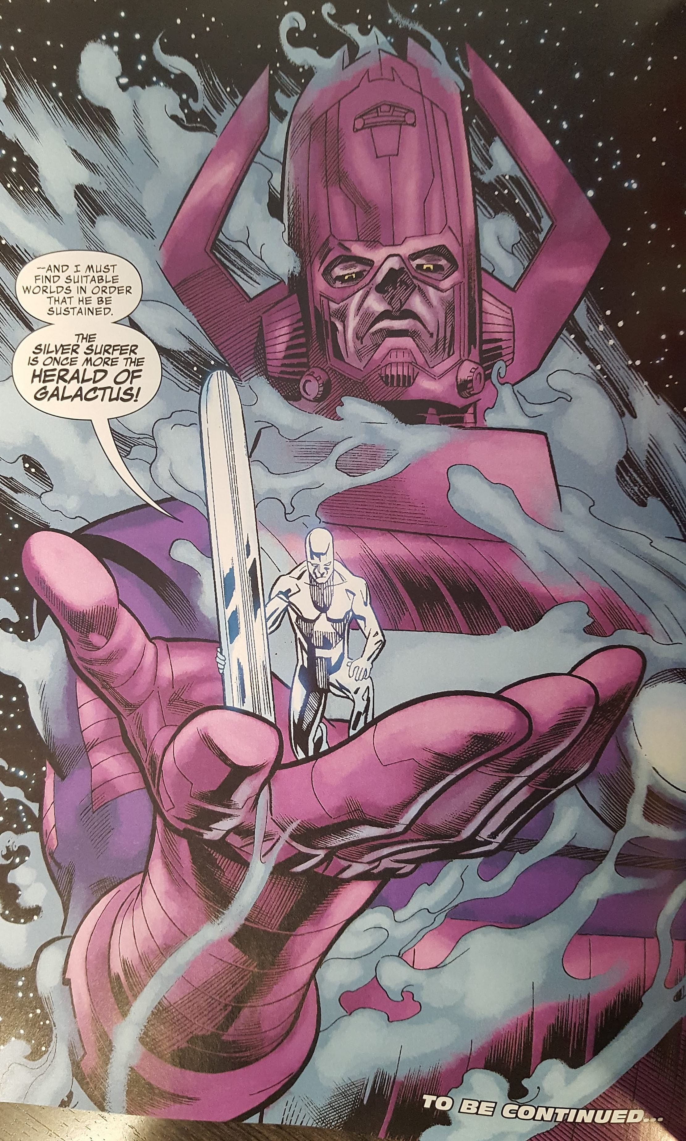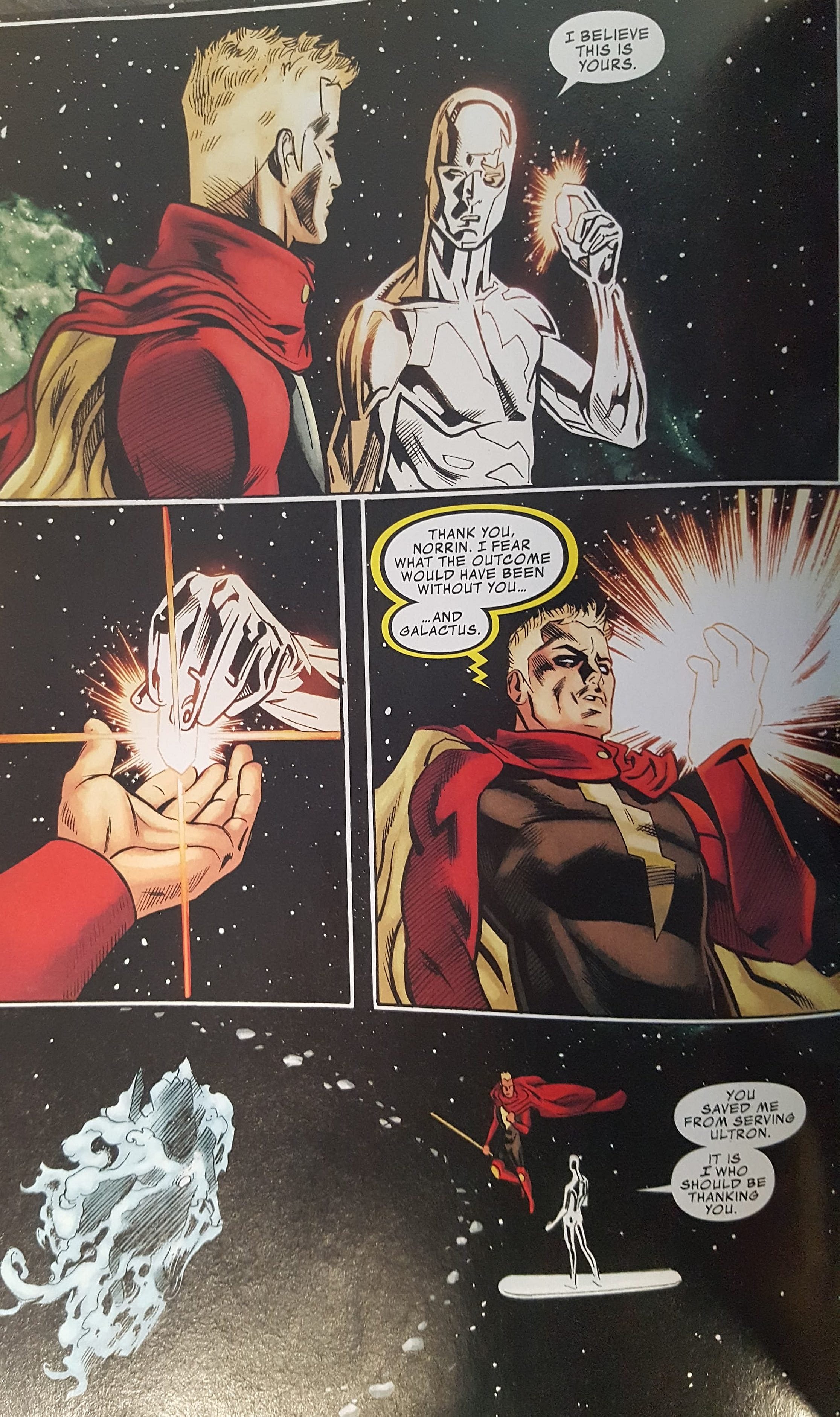 After the explosion, the Silver Surfer decides to give up the Soul Stone and hand it to Adam Warlock. He has a new mission and it’s one he has done in the past. He is now the Herald of Galactus once again and he must find worlds to sustain Galactus’ hunger.
