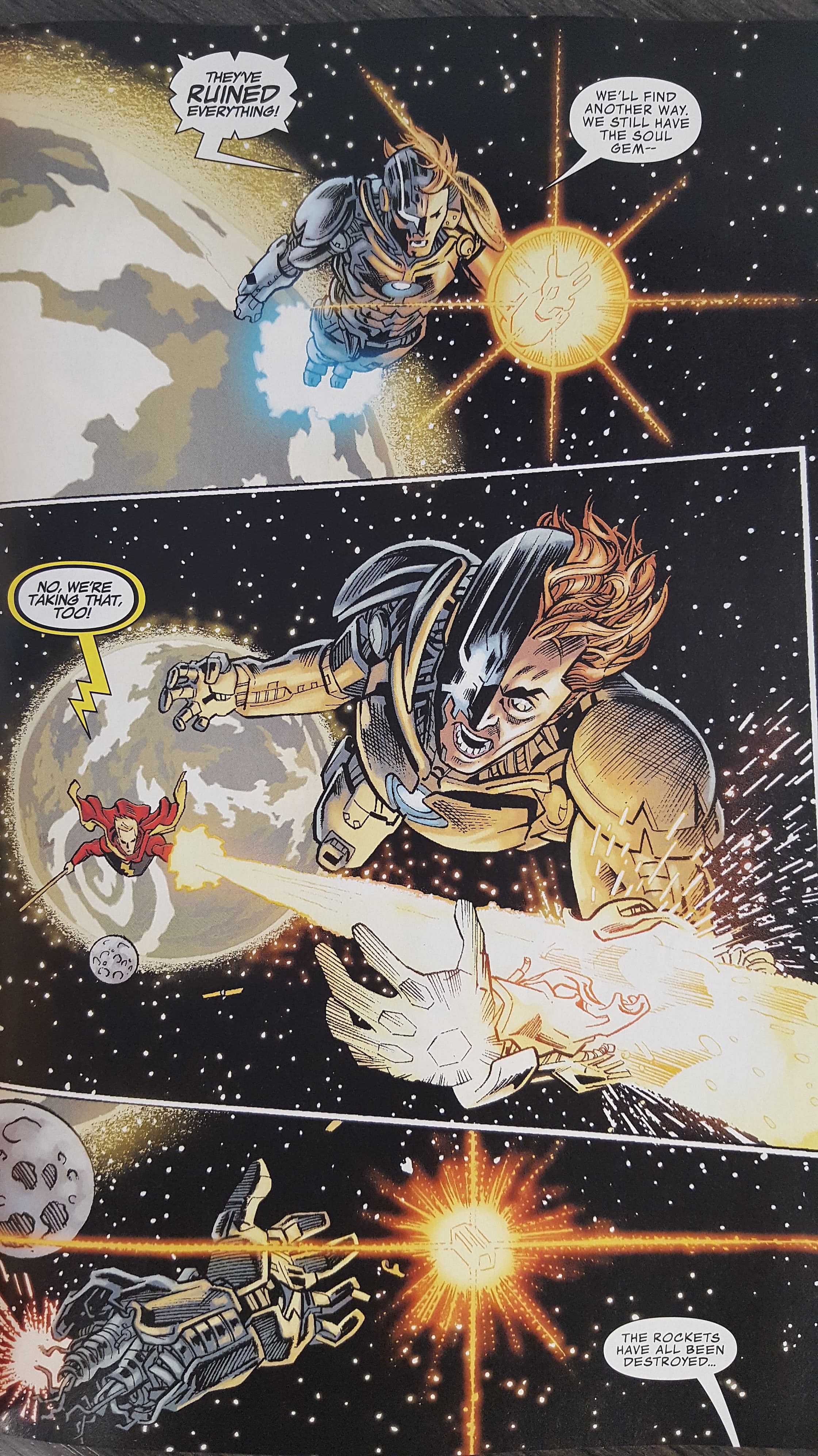 Unfortunately, for him Adam Warlock is in hot pursuit and is determined to ensure that Ultron no longer controls the Soul Stone. As Ultron thinks he has escaped Galactus’ wrath, Adam Warlock fires a blast that rips off his arm as he drops the Soul Stone.
