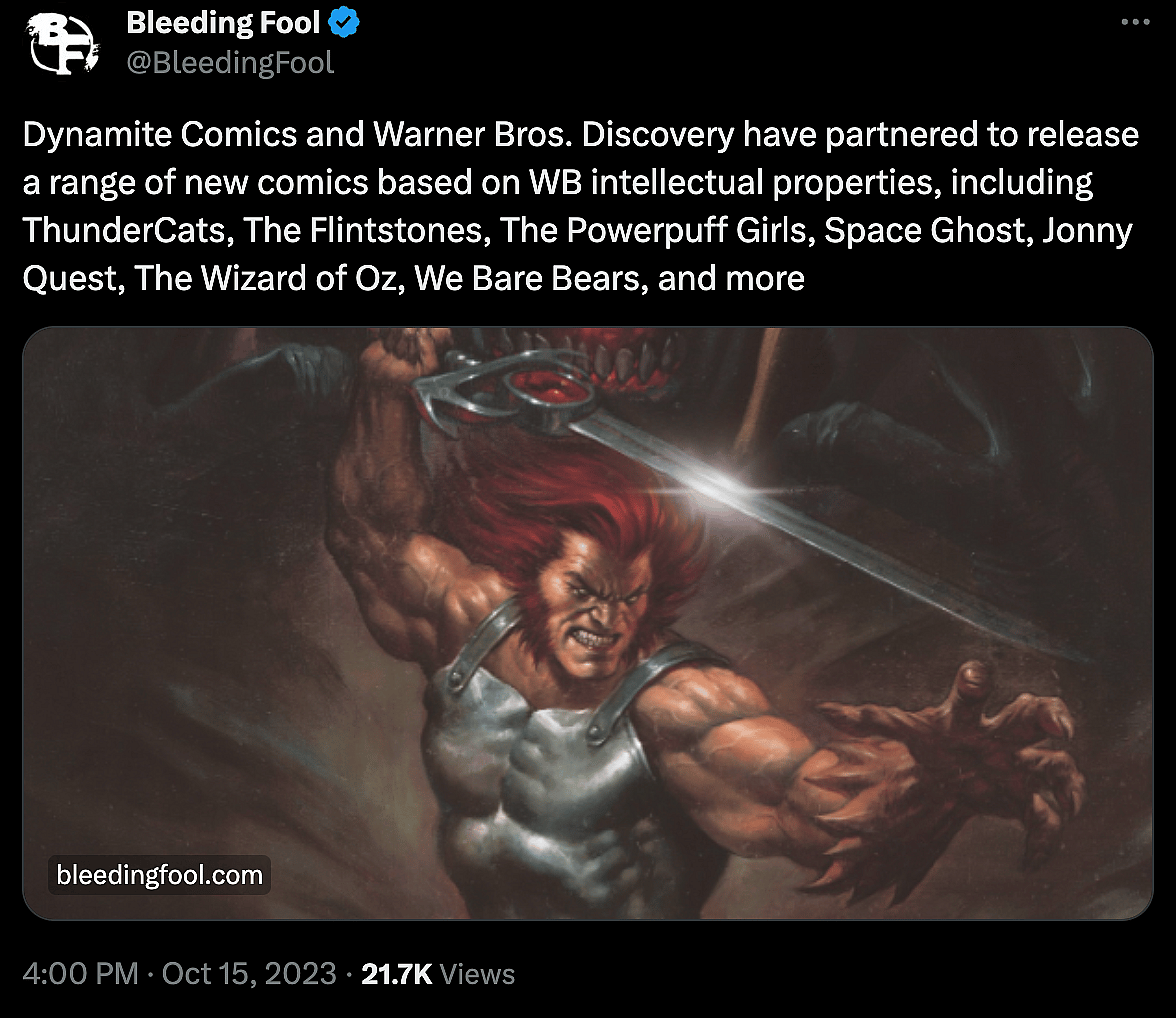 “Dynamite Comics and Warner Bros. Discovery have partnered to release a range of new comics based on WB intellectual properties, including ThunderCats, The Flintstones, The Powerpuff Girls, Space Ghost, Jonny Quest, The Wizard of Oz, We Bare Bears, and more,” Bleeding Fool reported on X. Everybody who has predicted a grim fate for the gutted DC has taken notice.
