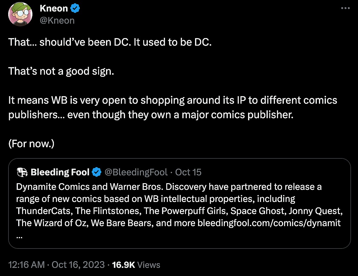“That… should’ve been DC. It used to be DC,” wrote Kneon, the co-host of Clownfish TV, on X. “That’s not a good sign.” He added, “It means WB is very open to shopping around its IP to different comics publishers… even though they own a major comics publisher. (For now.)” Disney made a similar deal with Dynamite, and IDW before them.