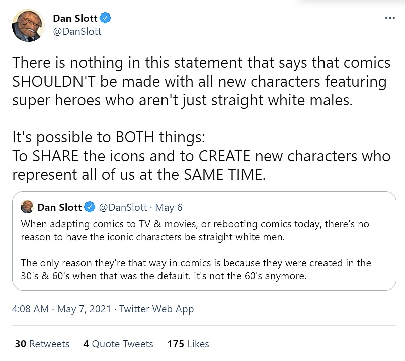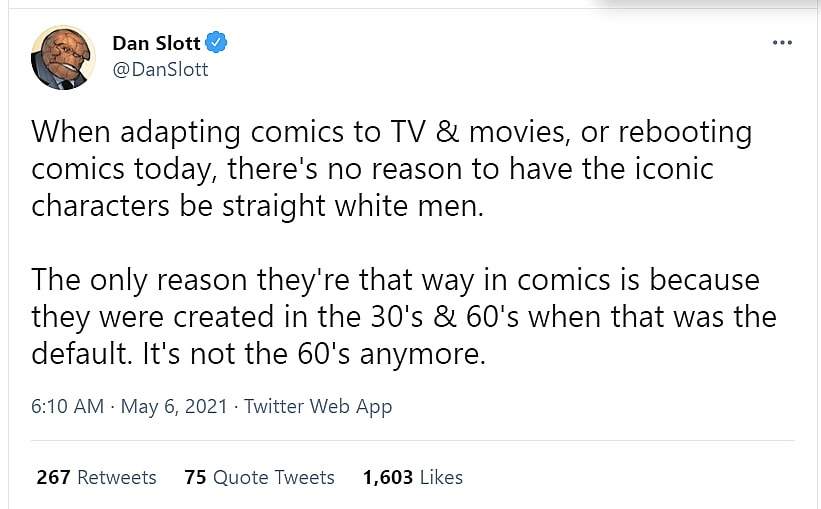 Slott posted to Twitter on May 6th, “When adapting comics to TV & movies, or rebooting comics today, there’s no reason to have the iconic characters be straight white men.”