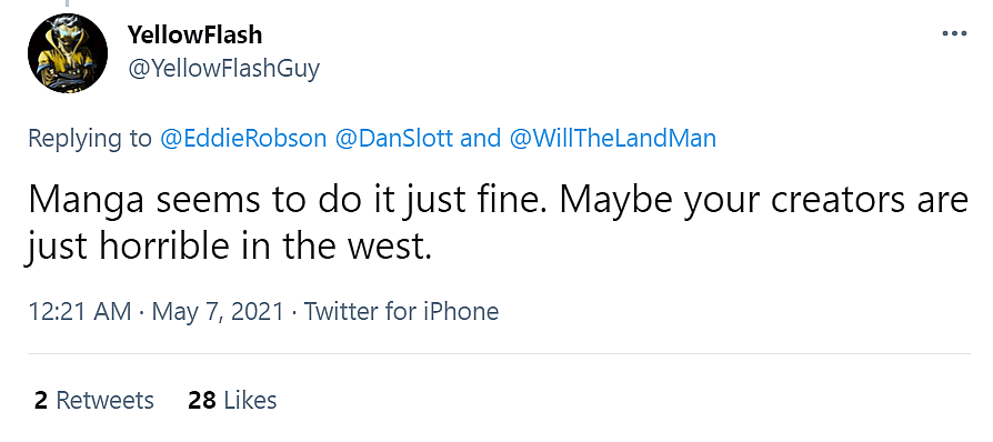 He wrote, “Manga seems to do it just fine. Maybe your creators are just horrible in the west.”