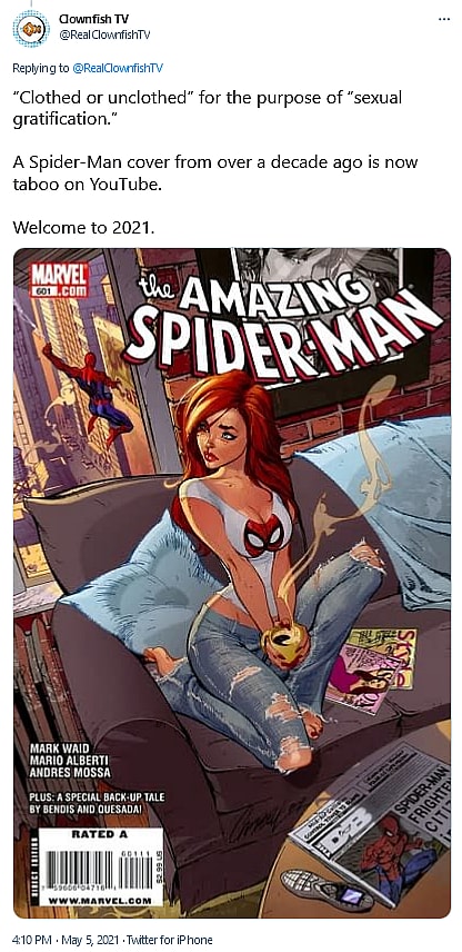 “‘Clothed or unclothed” for the purpose of “sexual gratification,’” added Clownfish TV. “A Spider-Man cover from over a decade ago is now taboo on YouTube. Welcome to 2021.”