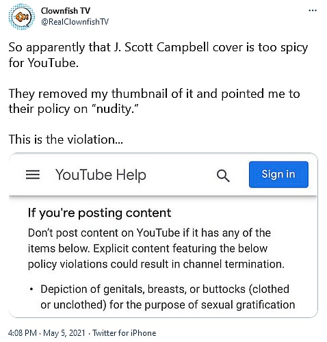 On May 5th, shortly after publishing their coverage of the Campbell situation, the official Clownfish TV Twitter account reported that YouTube had apparently found the cover art to be “too spicy,” as the site had “removed my thumbnail of it and pointed me to their policy on ‘nudity.’”