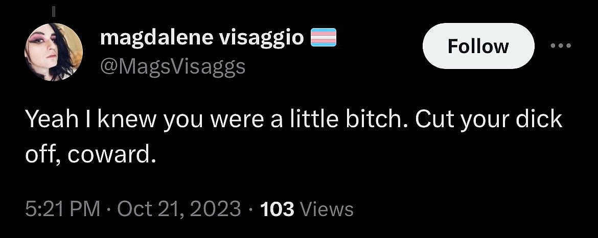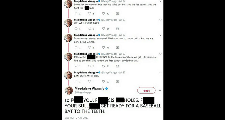The most bizarre and egregious tweet came from an exchange where Visaggio seemed to get agitated at a concerned fan. Vissagio tweeted, “Yeah I knew you were a little b****. Cut your d*** off, coward.”