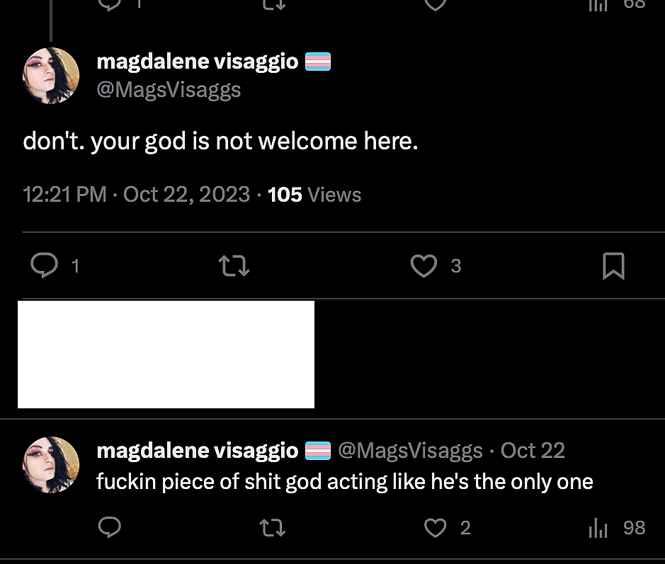 In one exchange, Visaggio began attacking God, arguing with a fan saying “your god is not welcome here.” He took the over-the-line attack a step further, saying “f***ing piece of s*** god acting like he’s the only one.”
