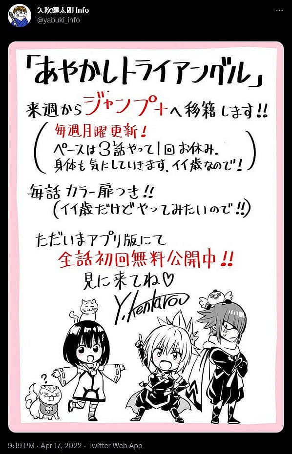 Sharing a message to his official Twitter account in light of the news, Yabuki further informed fans (via translation provided by Twitter user @maaaaamin_dayo_) that not only would the series update every Monday, but also each chapter would come with a new color page and he’d be taking a break every three chapters.