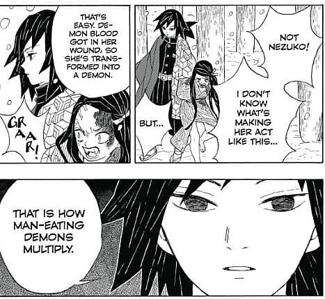 Tanjiro’s sister, Nezuko, is transformed into a demon after the demon’s blood that attacked her and her family is mixed in her blood.