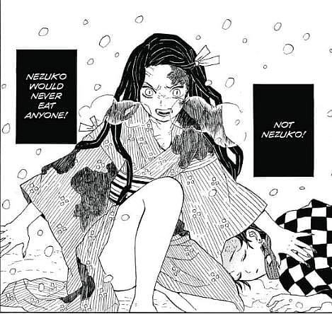 However, unlike most other demons that transform and feast upon their friends and family due to their ravenous hunger, Nezuko protects Tanjiro and chooses not to eat him when they two are confronted by Giyu Tomioka.