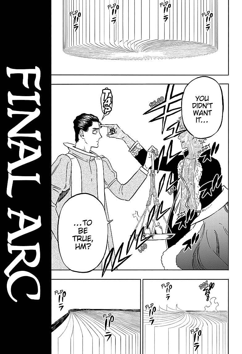 Though Damnatio attempts to stop Julius’ transformation, it unfortunately turns out to be too little too late, as the former Julius taunts him “You didn’t want it to be true, hm?” while the announcement that Black Clover has entered its Final Act appears on the side of the page.