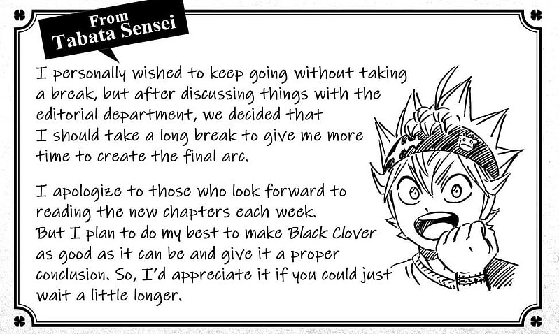 “This may be difficult news for those looking forward to the next chapter, but we request your patience and understanding,” the message concluded “We ask that you continue support Black Clover going forward.”