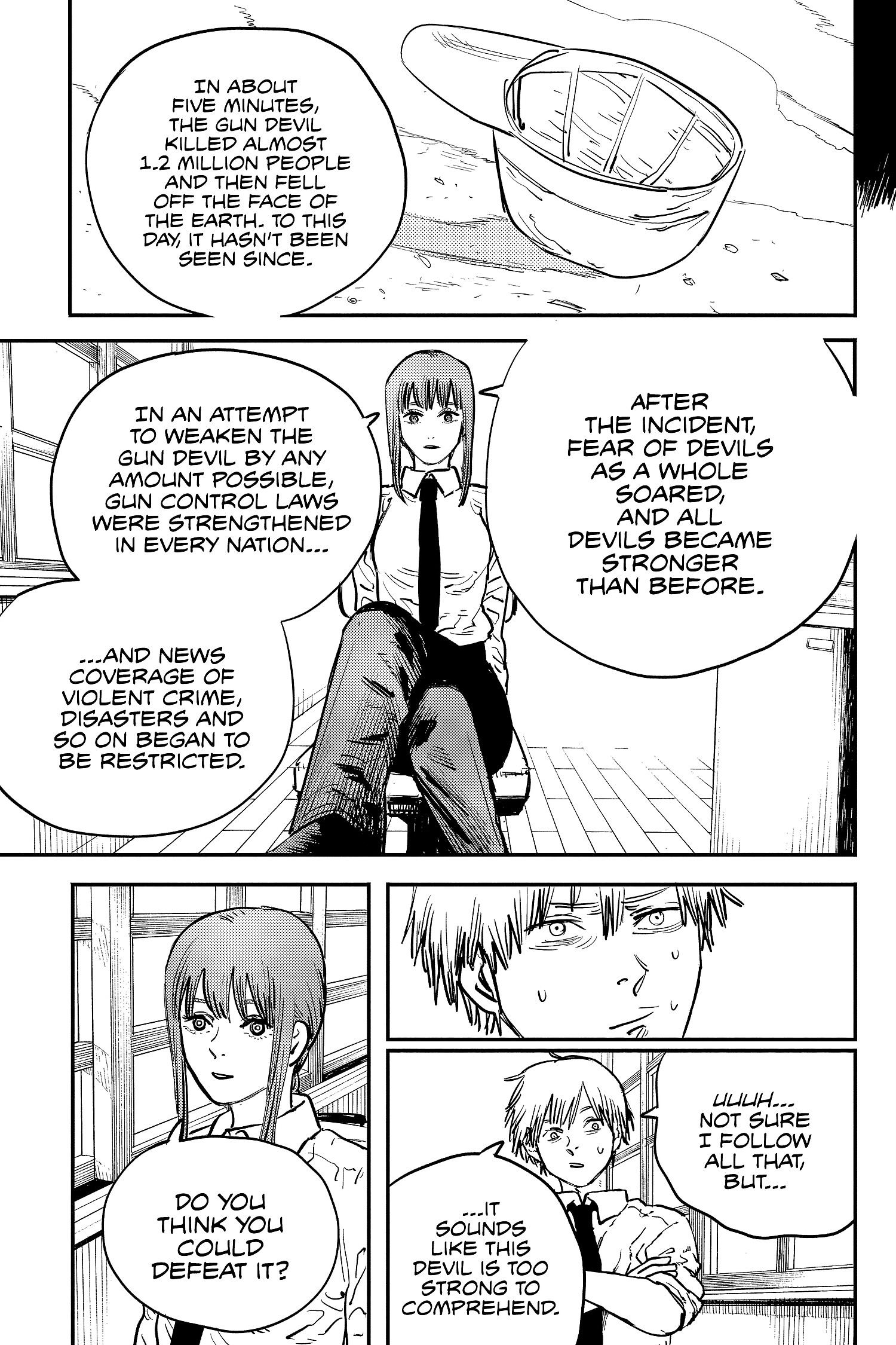 In the aftermath of his retribution, Denji is approached by the Public Safety Division, a government group tasked with hunting down Devils, who offer him a stable life in exchange for his help in taking down the Gun Devil, whose actions were responsible for the single greatest mass death event in human history.
