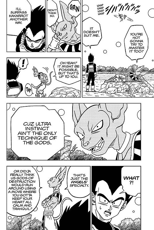“That’s just the Angels’ specialty,” he tells a shocked Vegeta. “Or didja really think us Gods of Destruction would run around using a move where you gotta keep your heart all calm and tranquil?”