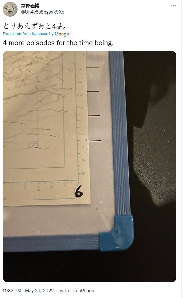 Sharing a corner shot of an in-progress page, Togashi tweeted, “4 more chapters for the time being.”