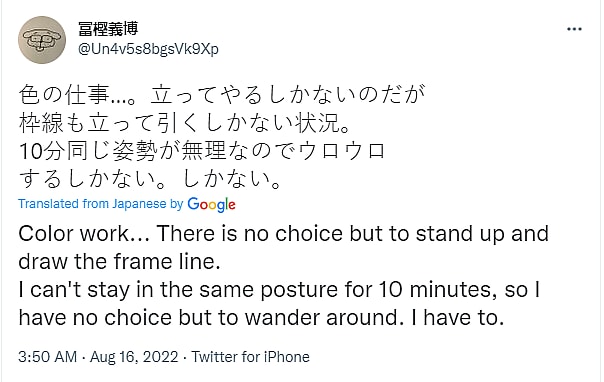 “I have no choice but to stand up when coloring my current drawings. Besides, I have to stand up when drawing a line of the panels. I can’t keep my posture even for 10 minutes, so I have no choice but to roam around. No choice.”