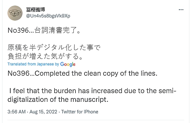 On August 15th, the mangaka noted that while he had “finished writing out a final copy of characters’ dialogues,” he felt “more burdened now that the process of drawing my manuscripts is half-digitalized.”