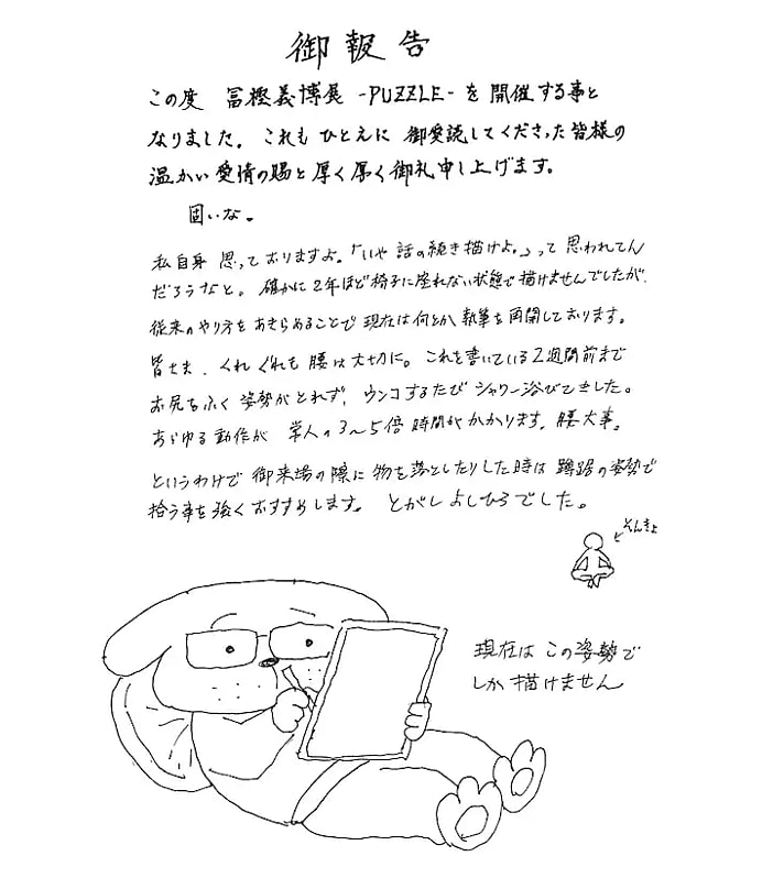 “I am pleased to announce the Yoshihiro Togashi exhibit-PUZZLE-..” Togashi announced. “Allow me to express my sincere gratitude to you all. This was only possible thanks to the warm feelings and support of the readers. That was stiff of me, huh? I think so too.”