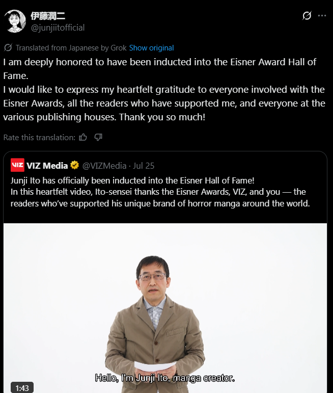 Only the outpour of grateful energy didn’t stop there, friends and neighbors. Being the extrovert that he is, Ito went to social media to share with his rabid following of spiral-brained fanatics the good news. Below is a translated tweet from the author, and his X account.