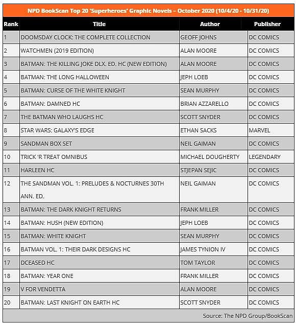 If you segment out the manga offerings and only focus on western superheroes, DC Comics dominates the top 20 list with 18 offerings. The only non-DC Comics graphic novels are a Trick ‘R Treat Omnibus by Michael Dougherty published by Legendary and Marvel Comics’ Star Wars: Galaxy’s Edge by Ethan Sacks.