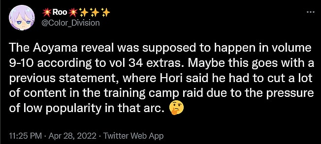 “The Aoyama reveal was supposed to happen in volume 9-10 according to volume 34 extras,” they wrote. “Maybe this goes with a previous statement, where Hori said he had to cut a lot of content in the training camp raid due to the pressure of low popularity in that arc.”