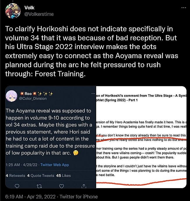 Taking notice of @Color_Division’s tweet, @Volkerstime clarified for English-speaking fans, “Horikoshi does not indicate specifically in volume 34 that it was because of bad reception. But his Ultra Stage 2022 interview makes the dots extremely easy to connect as the Aoyama reveal was planned during the arc he felt pressured to rush through: Forest Training.”