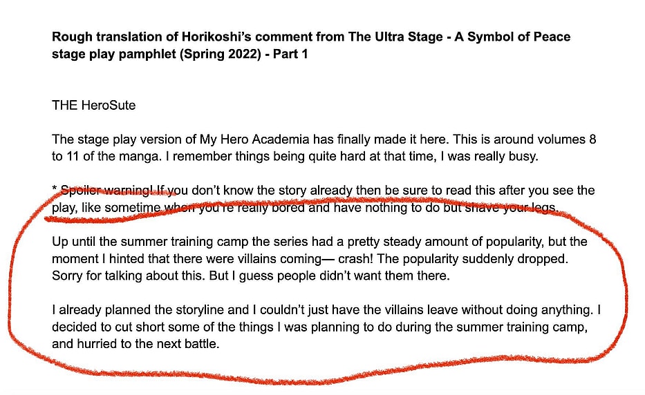This statement, which appeared in the playbill issued to attendees of the Spring 2022 My Hero Academia The Ultra Stage – A Symbol Of Peace stage play, saw Horikoshi reflect on how “Up until the summer training camp the series had a pretty steady amount of popularity but the moment I hinted there were villains coming—crash! The popularity suddenly dropped.”