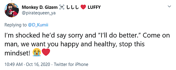 User @piratequeen_ya found themselves “shocked” that Oda would “say sorry and “I’ll do better”.