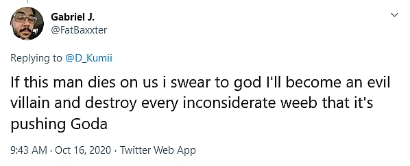 @FatBaxxter voiced an opinion held by many One Piece fans, saying that “if this man dies on us I swear to god I’ll become an evil villain and destroy every inconsiderate weeb that it’s [sic] pushing Goda”.