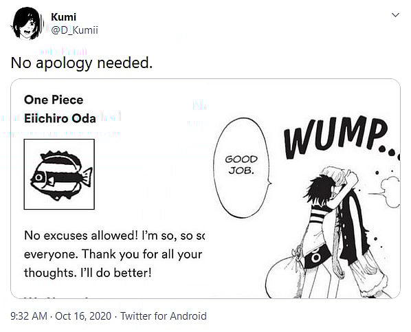 “No apology needed,” said user @D_Kumii.