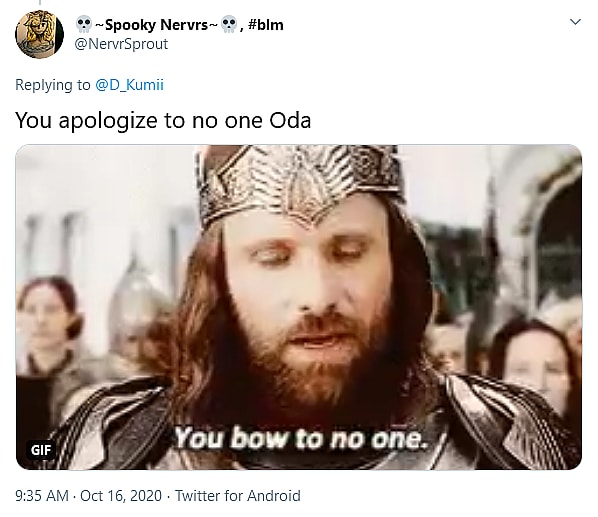 “You apologize to no one Oda,” said @NervrSprout, a reference to Aragorn’s command to the hobbits at the end of the Lord of the Rings.