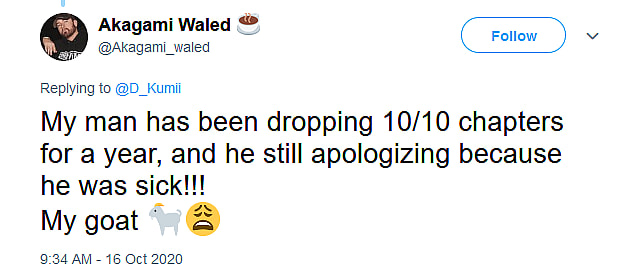 @Akagami_waled noted that Oda “has been dropping 10/10 chapters for a year, and he still apologizing because he was sick” and declared the mangaka to be “my GOAT”.