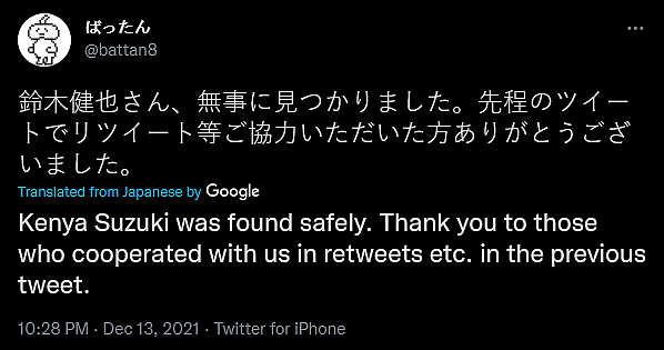 A short time later, Battan revealed that Suzuki had been “found safely,” but did not provide any further details regarding his disappearance.