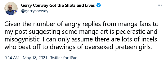 “Given the number of angry replies from manga fans to my post suggesting some manga art is pederastic and misogynistic,” wrote Conway, “I can only assume there are lots of incels who beat off to drawings of oversexed preteen girls.”