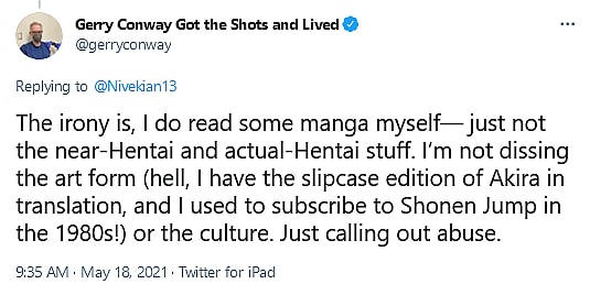 After finding himself having been ‘taken to task’ for his disingenuous criticism of the manga medium for a solid week, Conway returned to the subject on May 18th, doubling down on his self-perceived sense of moral superiority and dismissing those who disagreed with his initial posts as ‘incel’ pedophiles.