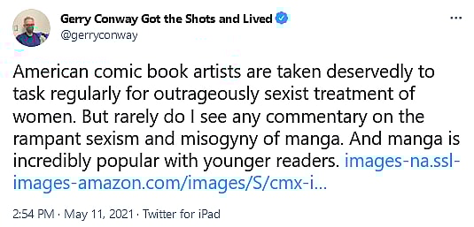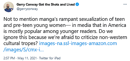 In a follow-up tweet, Conway continued, “Not to mention manga’s rampant sexualization of teen and pre-teen young women— in media that in America is mostly popular among younger readers.”