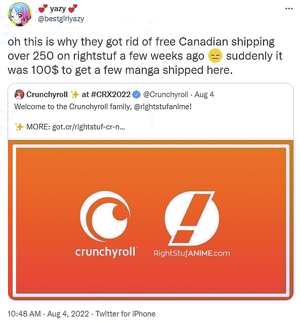 @bestgirlyazy asserted, “Oh this is why they got rid of free Canadian shipping over 250 on rightstuf a few weeks ago. Suddenly it was 100$ to get a few manga shipped here.”