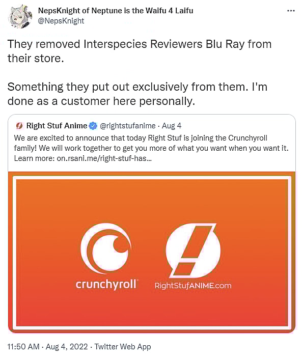 “They removed Interspecies Reviewers Blu Ray from their store,” observed oprainfall co-owner @NepsKnight. “Something they put out exclusively from them. I’m done as a customer here personally.”