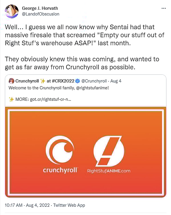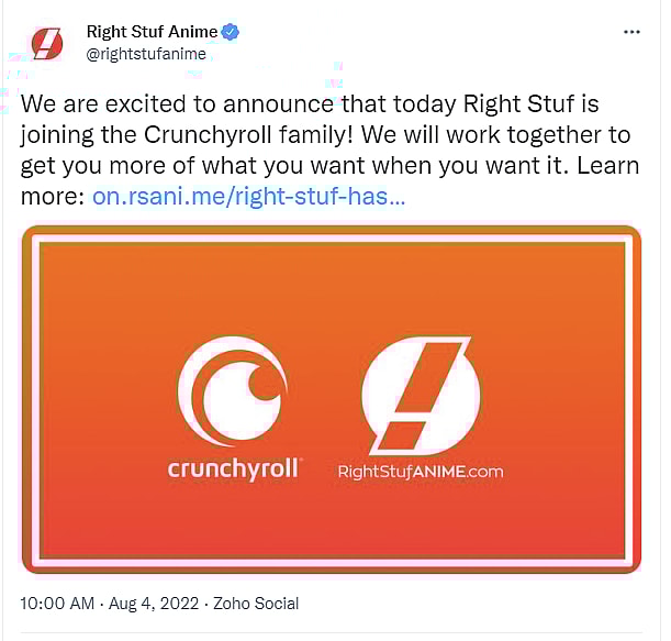 The alarming news came on August 4th when Right Stuf announced via their official Twitter account, “We are excited to announce that today Right Stuf is joining the Crunchyroll family! We will work together to get you more of what you want when you want it.”