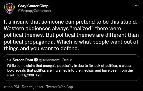 “It’s not the lack of politics,” declared @Wins98Tech. “You don’t need a f–king doctorate to see the political meaning of some of these mangas, its their ability to discuss themes subtlety without screaming at the reader and avoiding instantly dated references that ruin the story.”