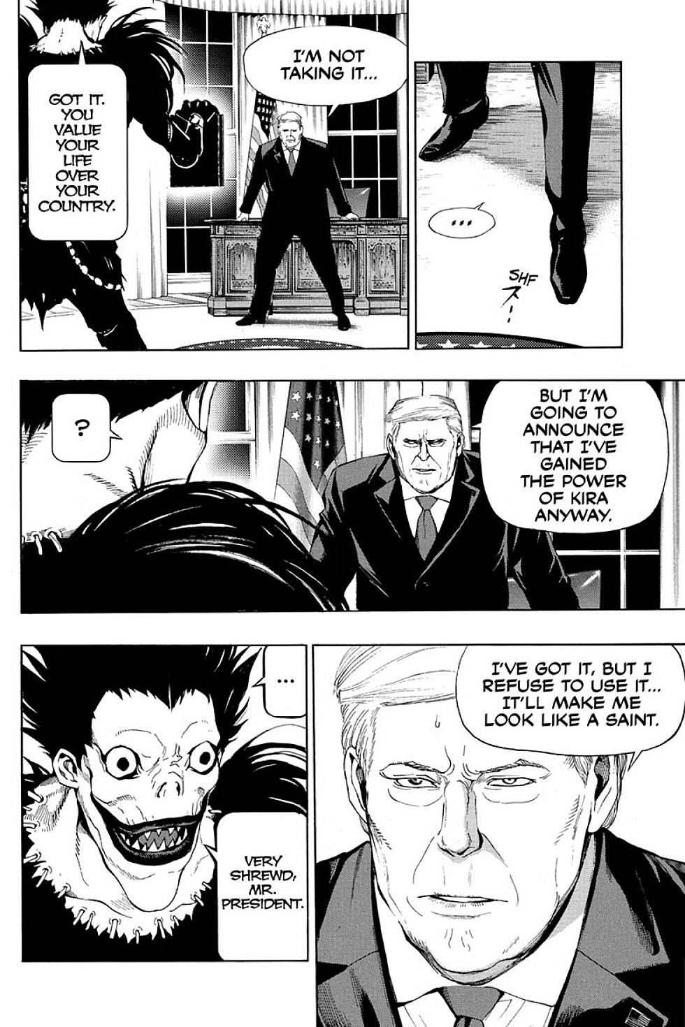 “While some readers were complaining about Marvel turning a politician into a supervillain… Death Note was preparing to do the exact same thing with the exact same politician,” he recalled. “The series’ creators returned to the world of Death Note with The A-Kira Story, a one-shot that prominently featured a blatant parody of Trump receiving the titular Death Note and being too cowardly to use it.”