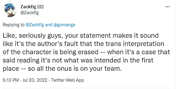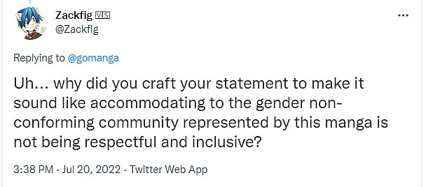 Manga localizer Zackfig questioned the wording of Seven Seas’ statement, asking the publisher, “Uh… why did you craft your statement to make it sound like accommodating to the gender non-conforming community represented by this manga is not being respectful and inclusive?”