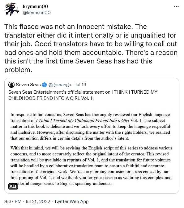 “In response to fan concerns, Seven Seas has thoroughly reviewed our English language translation of I Think I Turned My Childhood Friend Into a Girl Vol. 1,” the publisher informed readers.