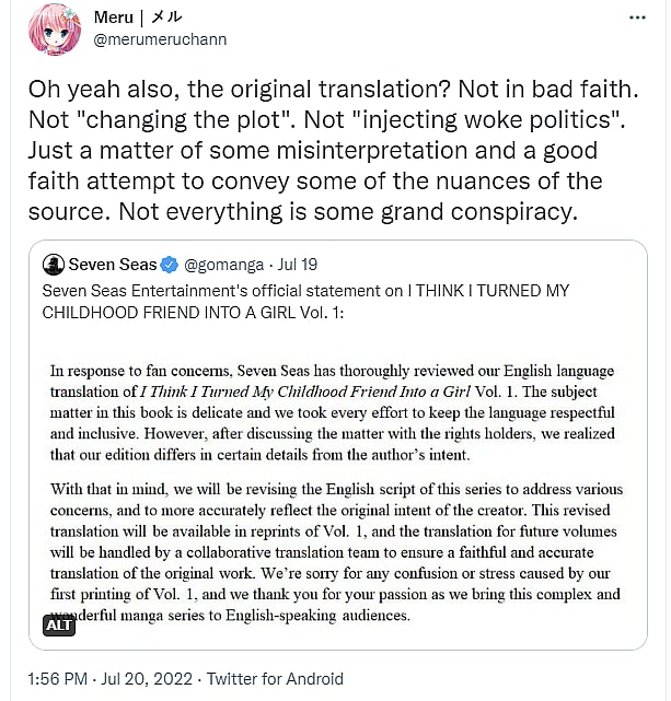 Returning to the subject a short while later, Meru added, “Oh yeah also, the original translation? Not in bad faith. Not ‘changing the plot’. Not ‘injecting woke politics’. Just a matter of some misinterpretation and a good faith attempt to convey some of the nuances of the source. Not everything is some grand conspiracy.”