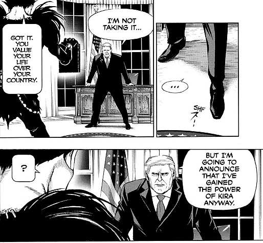 Upon hearing this new rule, President Trump refuses to accept the Death Note, but explains to Ryuk that he will claim that he’s received it anyways.