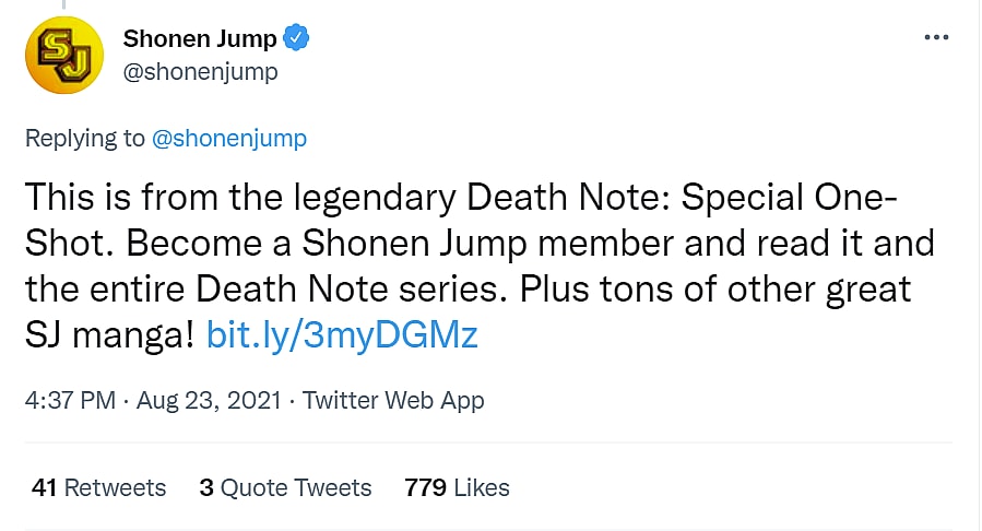The tweeted, “This is from the legendary Death Note: Special One-Shot. Become a Shonen Jump member and read it and the entire Death Note series. Plus tons of other great SJ manga!”